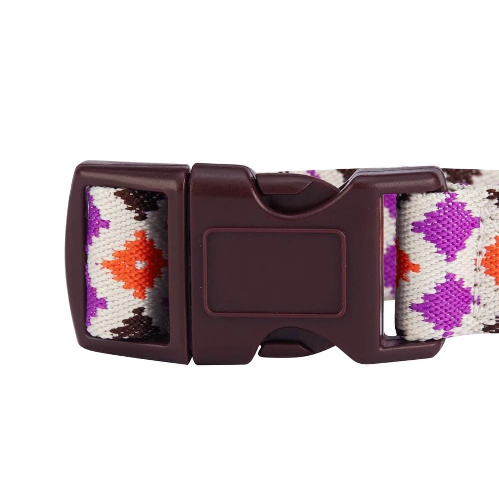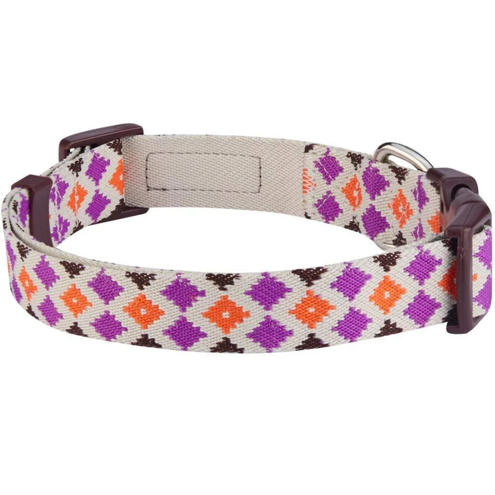 Elevate your pet’s style with the Jacquard Weave Tribal Geometric Pattern Dog Collar for Pets. This collar boasts a stunning vintage-inspired design that fuses classic elements with contemporary flair. The vibrant palette featuring rich purples and lively oranges is beautifully balanced with neutral beige tones, making it a perfect accessory for pets of any fur color.