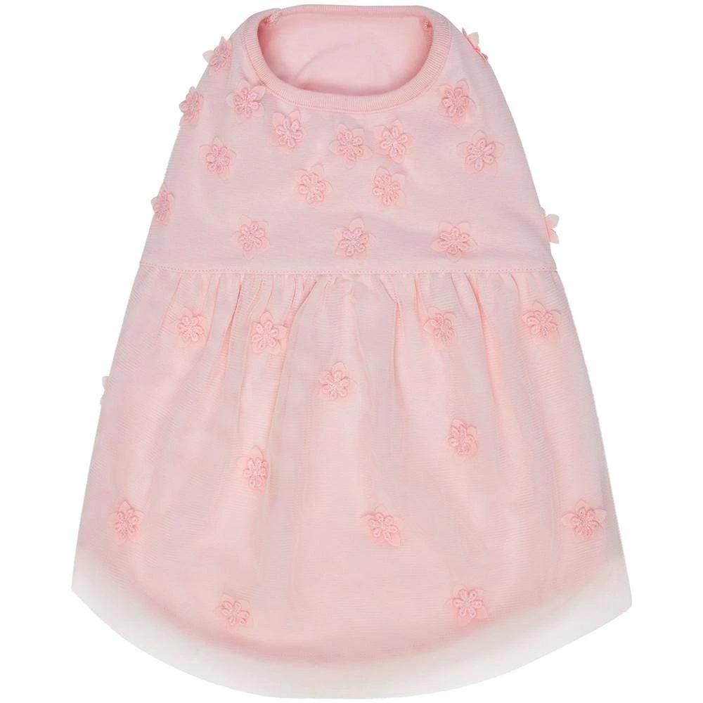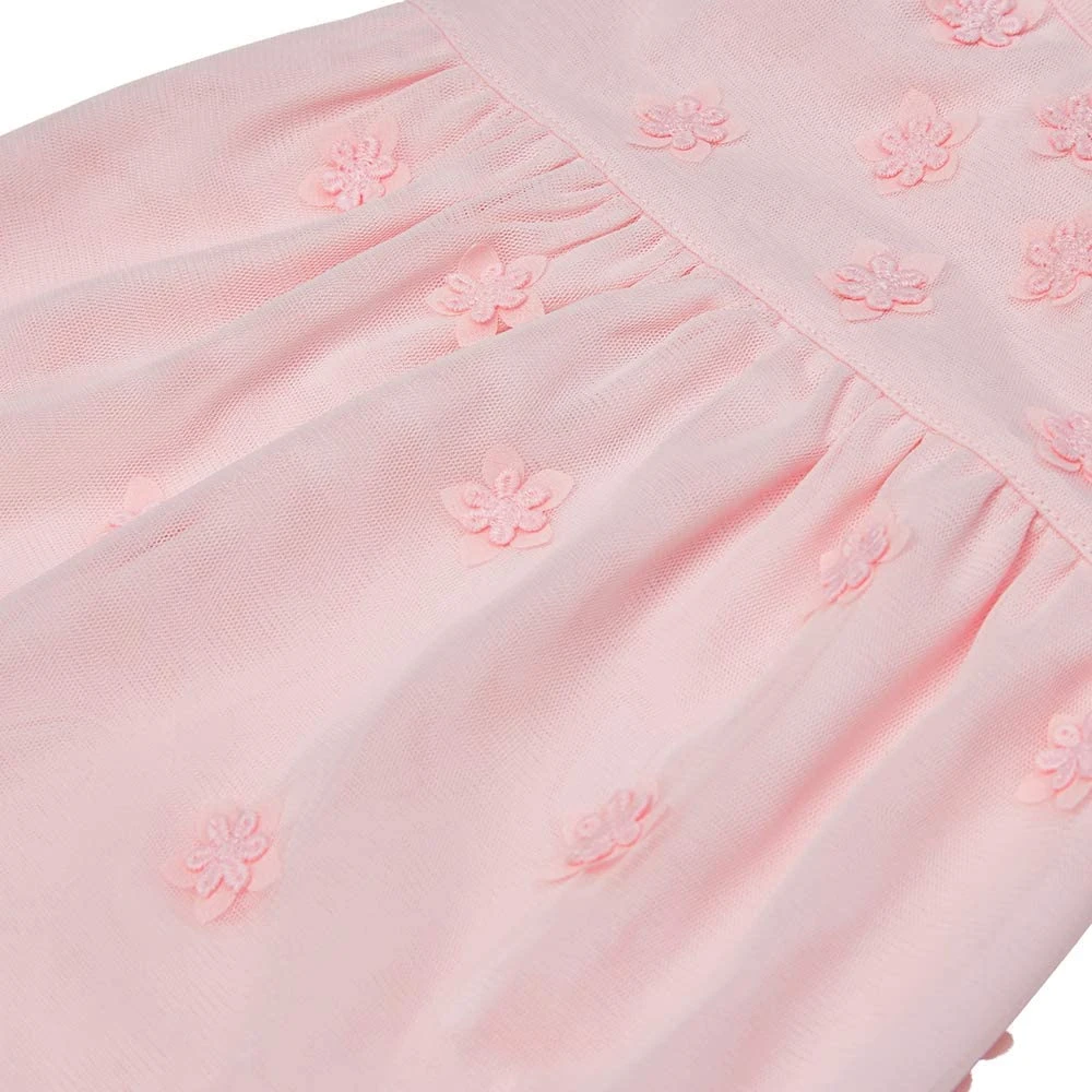 Crafted with meticulous attention to detail, this elegant dress showcases a stunning feminine pink hue complemented by a delightful tulle layer adorned with dainty flowers. Designed for the princess at heart, it’s both captivating and charming.