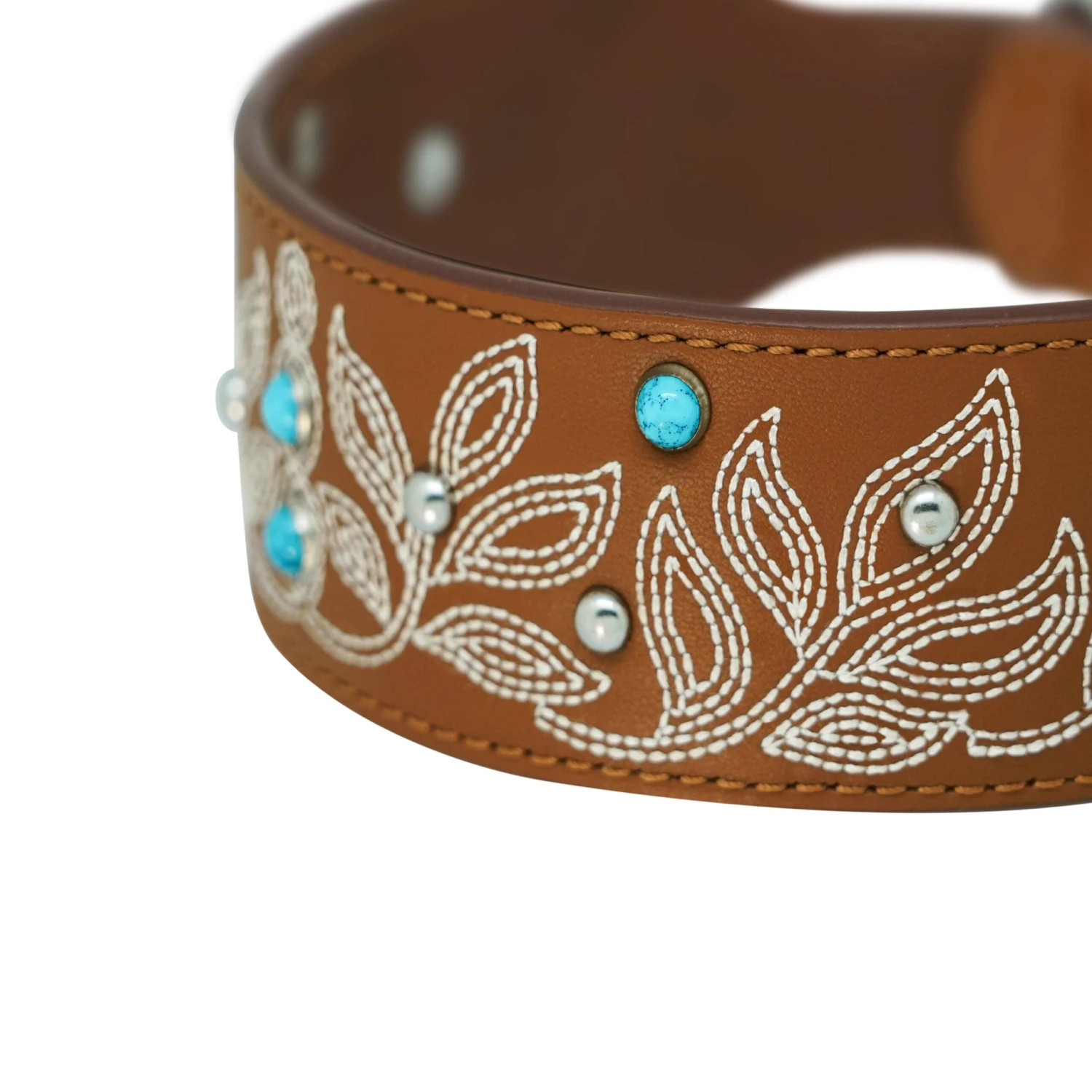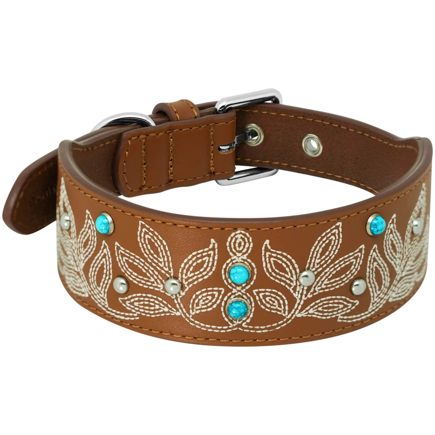Make a bold statement with this handcrafted leather dog collar, featuring ornate floral embroidery, flowing leaf motifs, and decorative turquoise accents. Designed for dogs with style, this wide band collar blends Western and bohemian influences with artisan-level detail. Ideal for everyday wear or special occasions, this collar is both practical and photogenic.